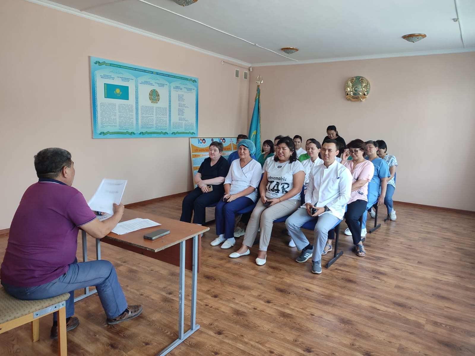 Инженер по ТБ и ОТ Балшенов К.Ж. проинформировал сотрудников об утверждении инструкции по организации антитеррористической защиты объектов, уязвимых в террористическом отношении, осуществляющих деятельность в области здравоохранения Республики Казахстан. Ознакомил со схемой оповещения на случай террористической угрозы, захвата заложников, и при иных чрезвычайных ситуациях в здании медцентра.