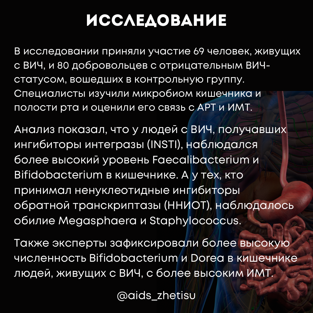 Исследование, проведённое учёными из Каролинского института (США), показало, что различные антиретровирусные схемы терапии (АРТ) влияют на кишечный и оральный микробиом, а также на индекс массы тела (ИМТ) у людей, живущих с ВИЧ. Результаты подчёркивают важность учёта изменений микробиома при выборе схем АРТ. Работа опубликована в журнале Scientific Reports.