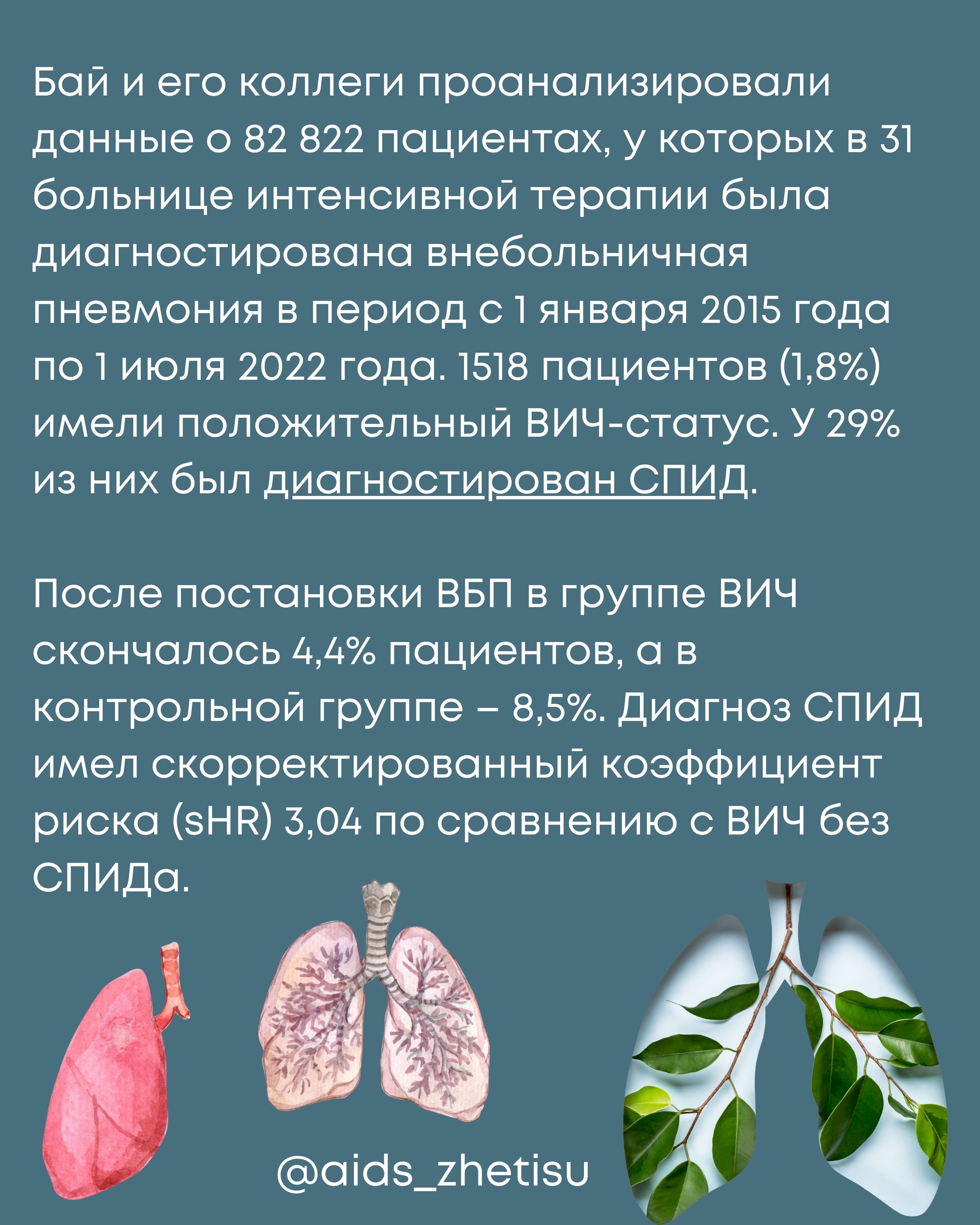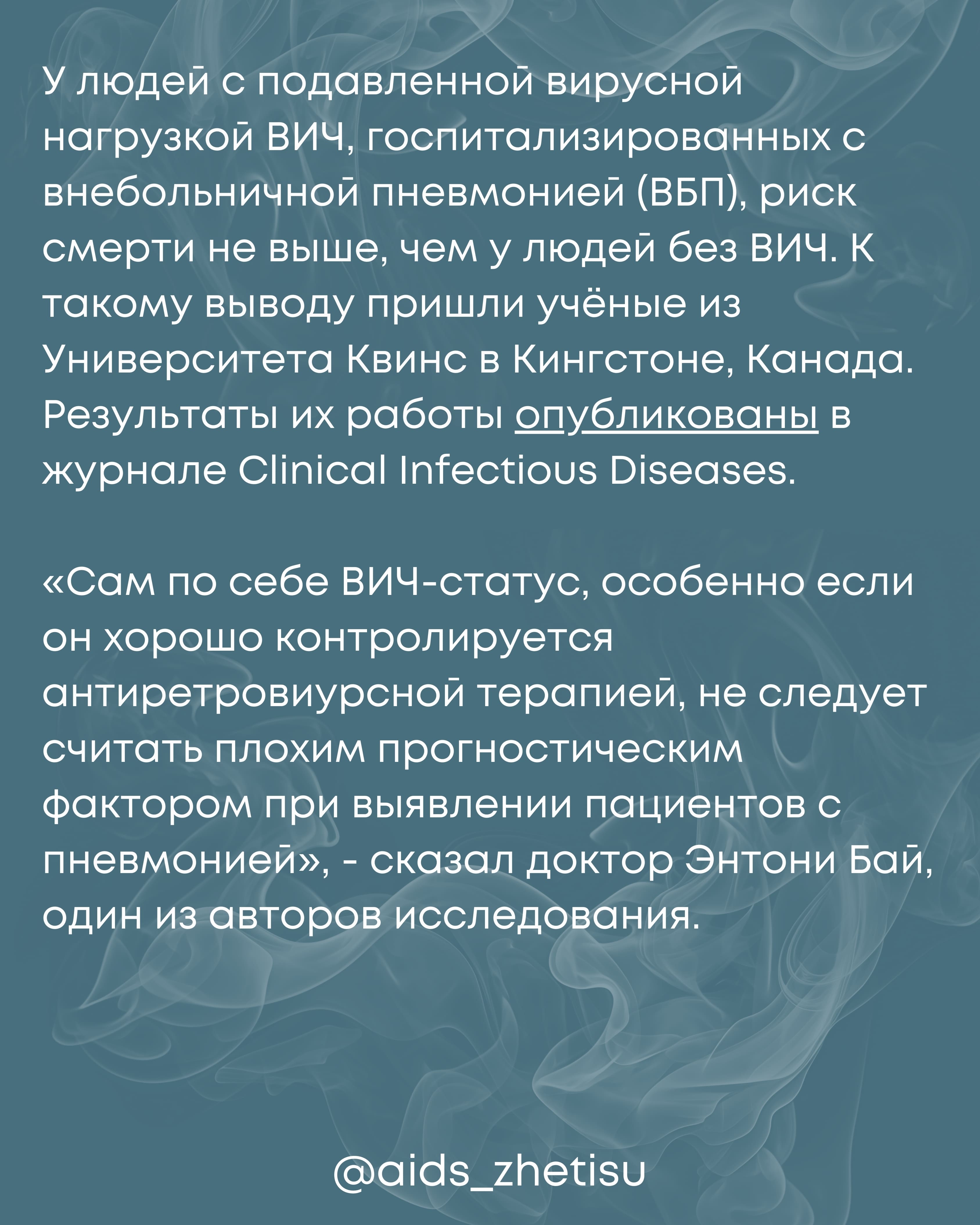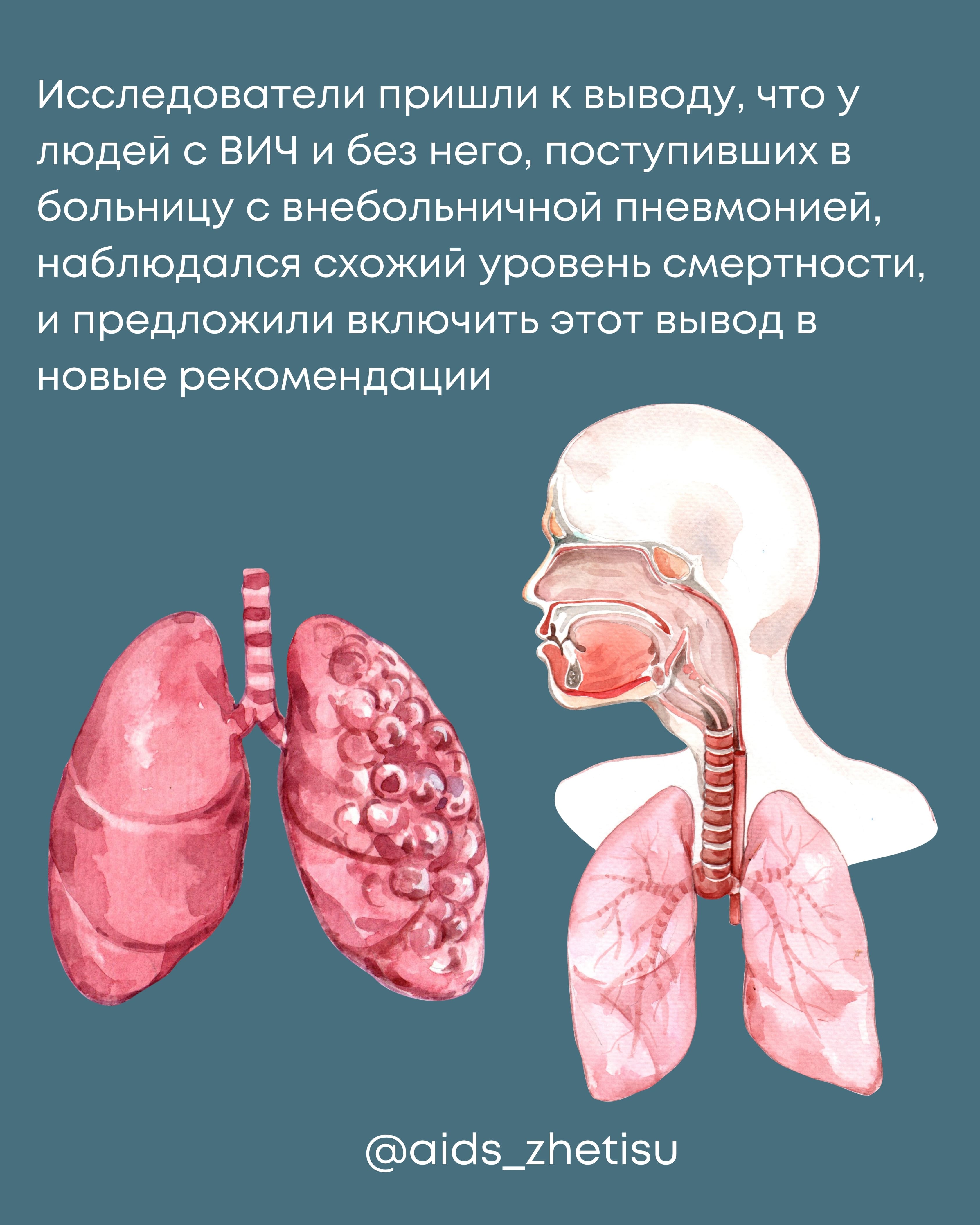 Недавнее исследование, проведенное учеными из Университета Квинс в Кингстоне, Канада, показало, что подавленная вирусная нагрузка ВИЧ не увеличивает риск смерти от внебольничной пневмонии (ВБП). Анализ данных 82 822 пациентов выявил, что для людей с хорошо контролируемым ВИЧ-статусом уровень смертности от ВБП не превышает таковой у пациентов без ВИЧ. По результатам исследования, риск смерти для пациентов с ВИЧ и СПИДом выше, чем для тех, кто имеет ВИЧ без СПИДа, но в целом риск смерти у обеих групп схож. Эти результаты подчеркивают, что хороший контроль ВИЧ не является плохим прогностическим фактором для больных пневмонией и могут быть включены в новые рекомендации по лечению и уходу.